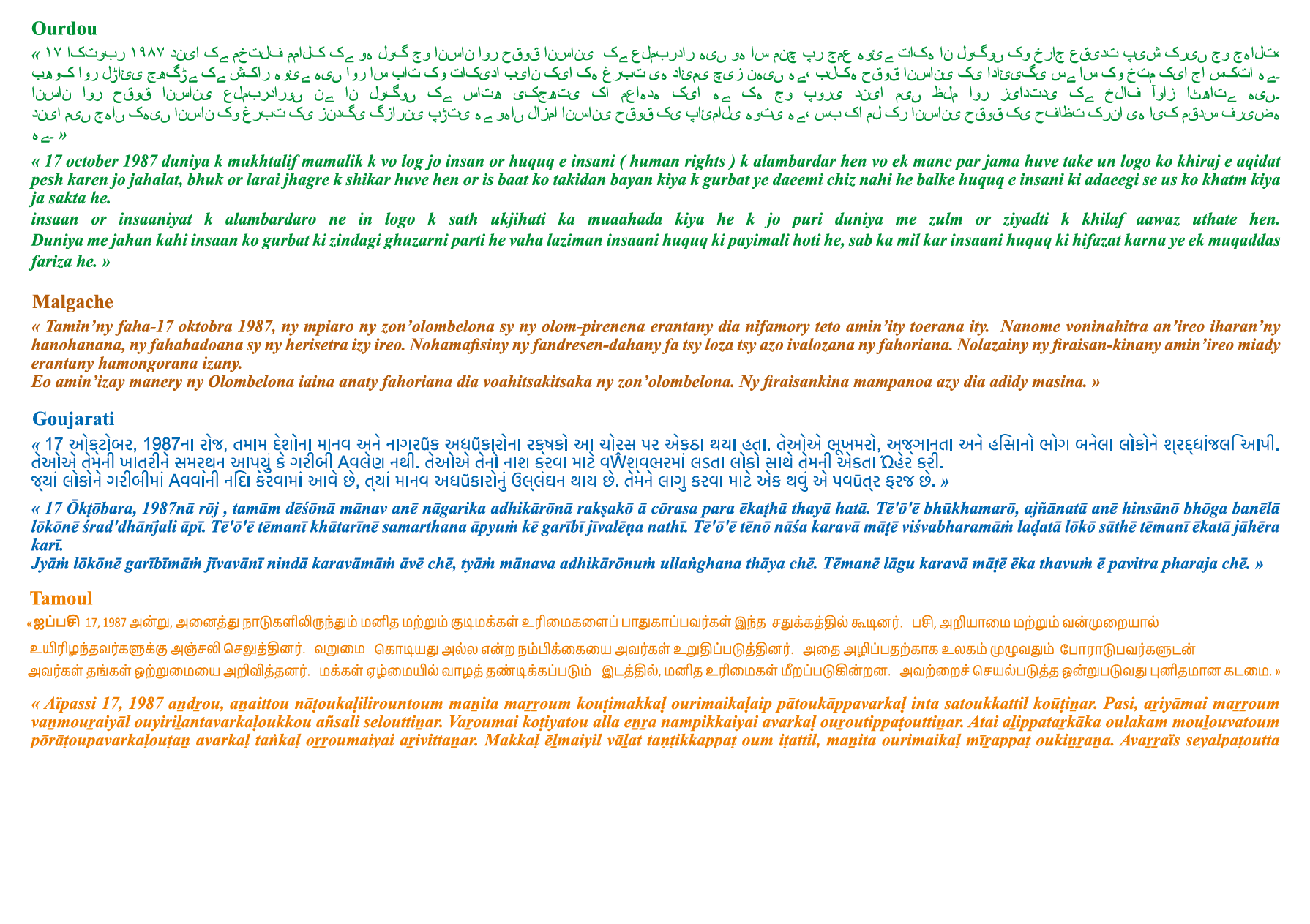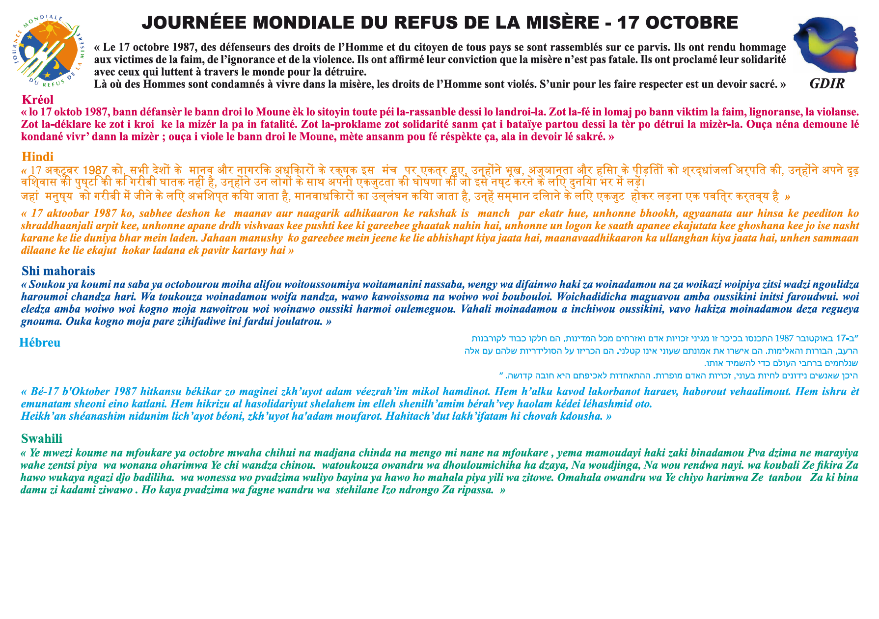 Message en 17 langues lors de la Journée du Refus de la Misere - 17 Octobre 2023